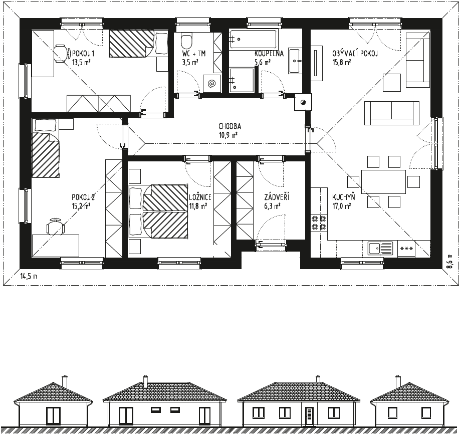 Uvedená cena nezahrnuje: základy a připojení domu na inženýrské sítě, vodorovnou hydroizolaci, podbití vazníků deskou OSB, komínové těleso, střešní krytinu, podbití přesahů střechy, okna a dveře, fasádu, izolaci soklu, klempířské prvky, hromosvod, vnitřní povrchové úpravy nosných stěn, vnitřní dělící příčky, tepelnou izolaci stropu, sádrokartonové podhledy, keramické obklady, výmalbu, vnitřní podlahy vč. tepelné izolace a krytiny, technické instalace a vybavení (vodovod, kanalizace, vytápění, větrání), zařizovací předměty a užitné vybavení, terasu, úpravy terénu, montáž a projekt.