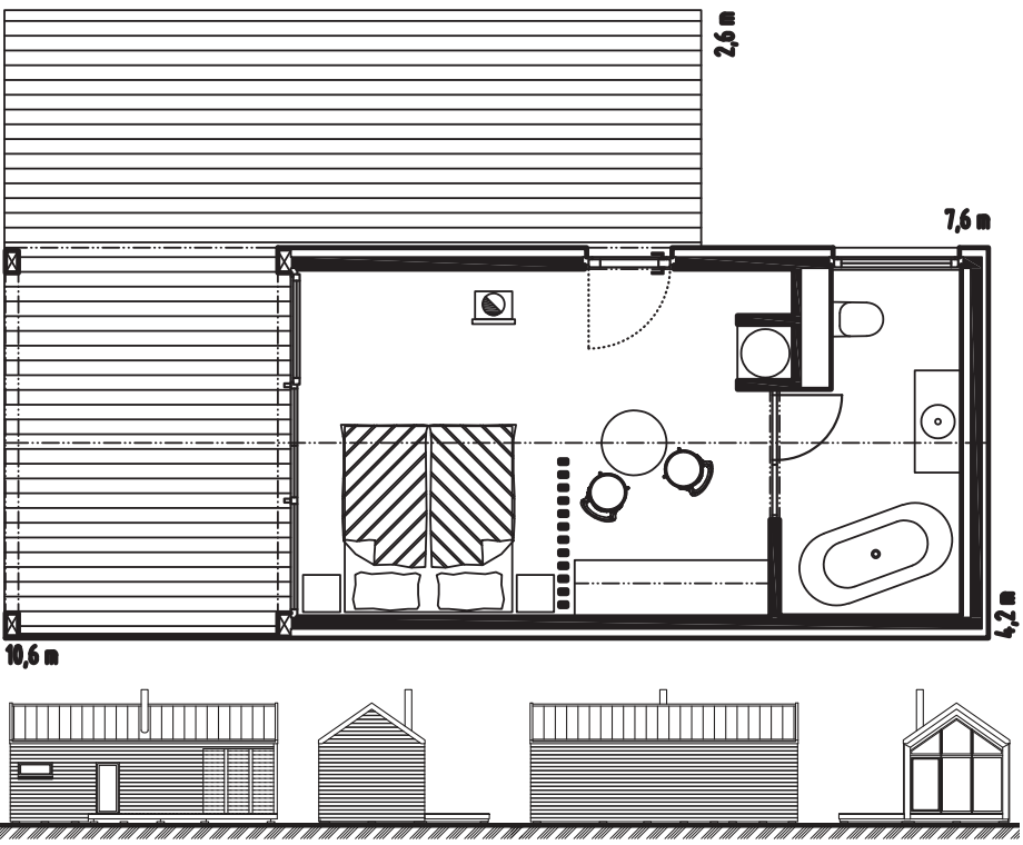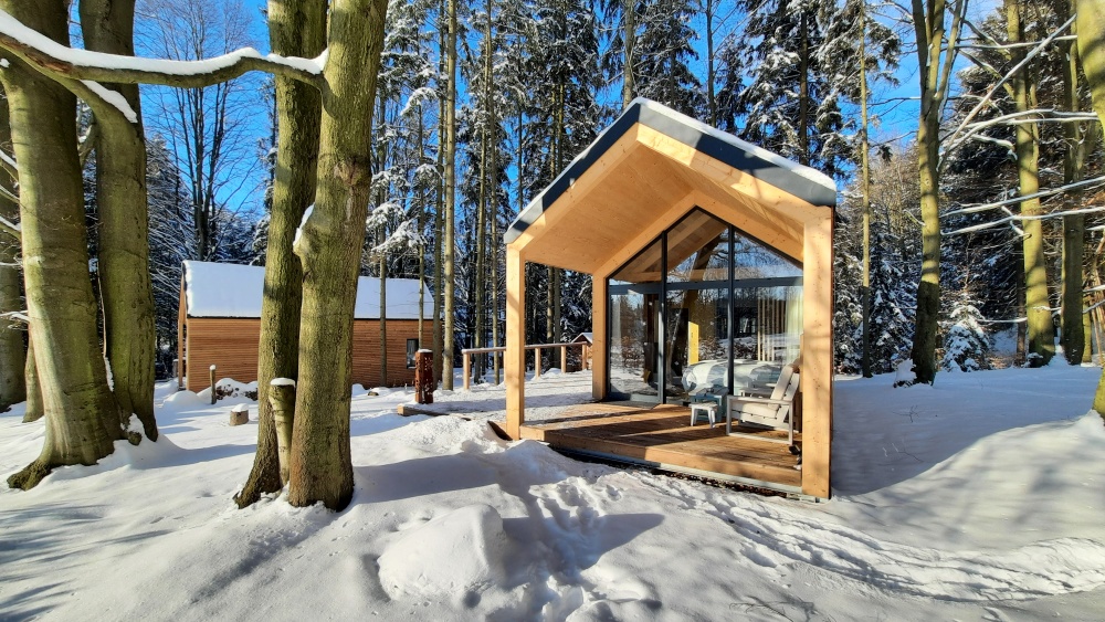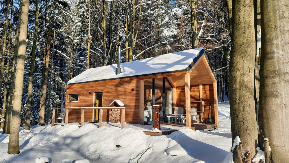 Rekreační chata Forest Garden Romance nabízí romantický prostor pro odpočinek a relaxaci dvou osob. Celoprosklený štít poskytuje dokonalé propojení s venkovním prostorem a zastřešená terasa se závětřím umožňuje venkovní posezení i v deštivých dnech. Díky střeše bez přesahů působí chata moderním designem. Chatu Forest Garden Romance je možné také realizovat v zrcadlově převráceném provedení.